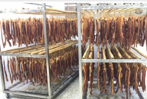 臘肉烘干機溫度保持在45至70℃(可按),溫度開始高,而后逐步降低,正確掌握烘房溫度是決定成品品質的關鍵。操作人員經經常檢查肉坯的干濕程度,如溫度過高,熱量大,則滴油過多,影響成品率。如溫度過低,則容易發生酸味而且色澤發暗,影響質量。烘焙時應分清級別,以防混淆。臘肉坯進烘房經14小時左右,視條坯干燥情況即可升至第 二層繼續烘焙。升層時里外竹竿相互調換位置,使條坯受溫均勻,再經24小時左右即可出房。